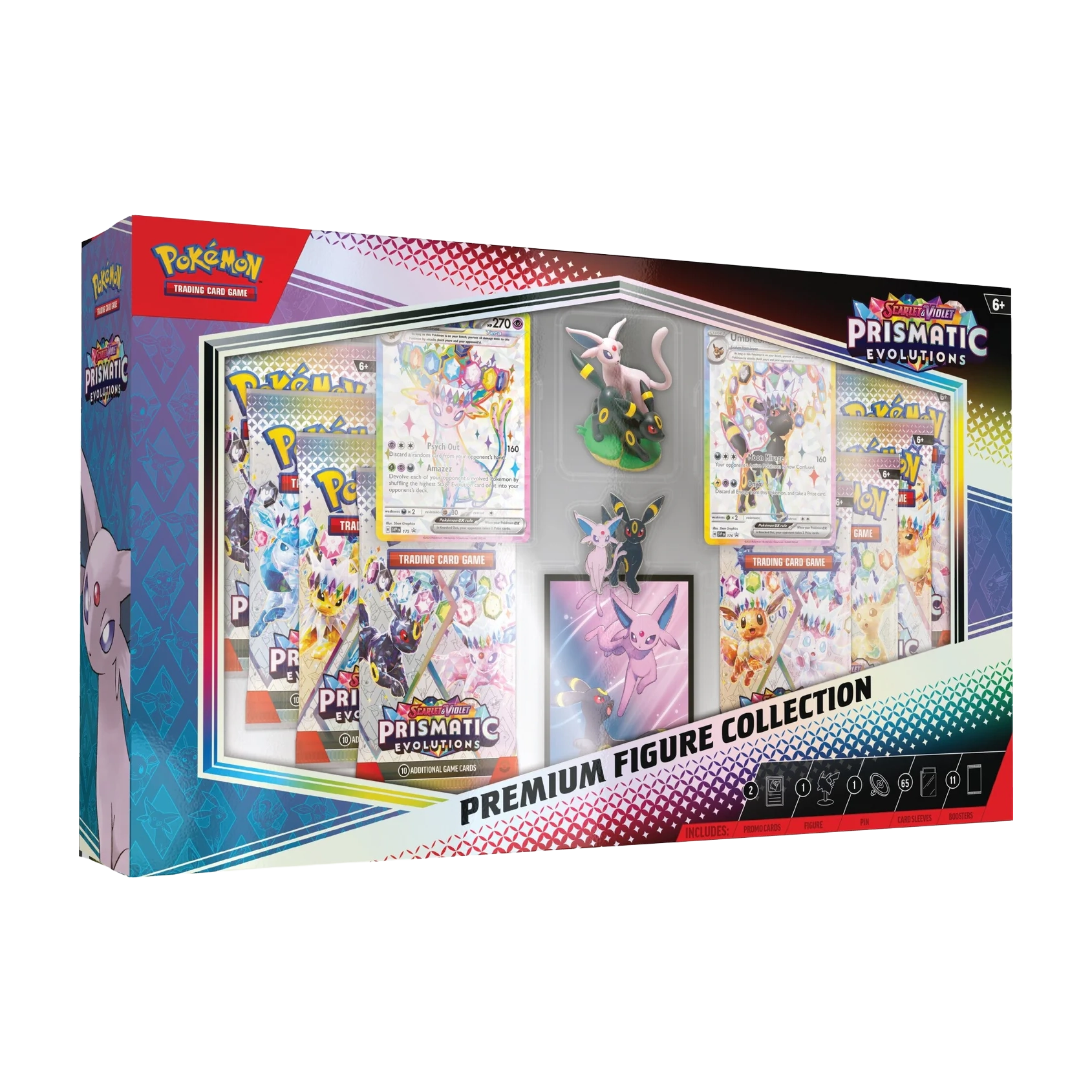 The Pokémon TCG: Scarlet & Violet-Prismatic Evolutions Premium Figure Collection includes: